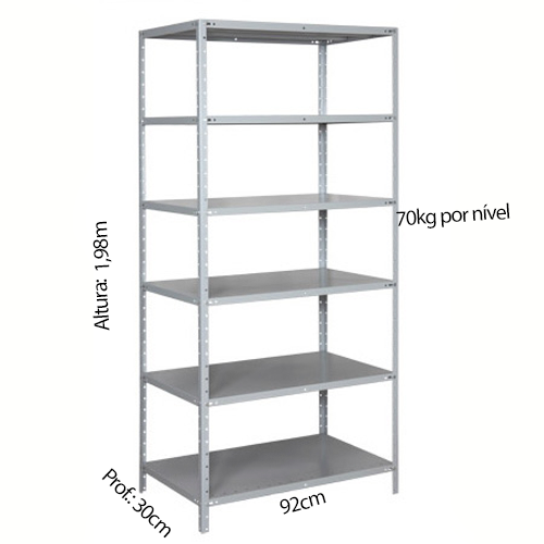 Categorias: 30cm, 70KG, ESTANTE EM AÇO PESADA P/ 70Kg/NÍVEL, Prateleiras, Todo Cinza